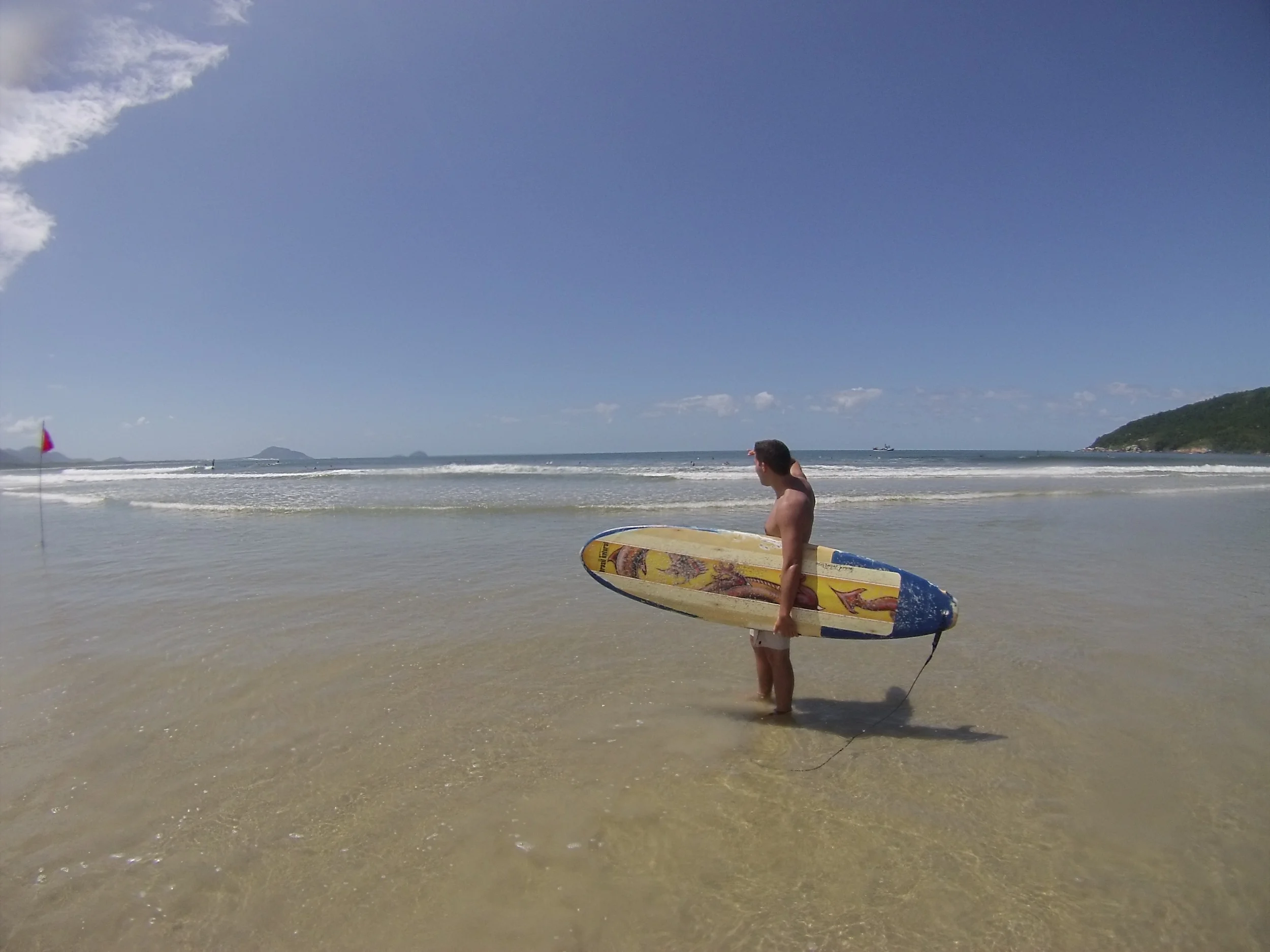 By the time we arrived it was almost noon and all in all the whole journey ate up more than a day, but we were unbelievably pleased with what greeted us. Floripa Surf Hostel was a collection of rooms laid around an inner courtyard of hammocks and trees, a small and relaxed destination just 200 yards from one of the best surf breaks on the island. Our first trip over the sand dunes less than half a block away lead to ecstatic feelings: the pristine turquoise waters of the ocean lay directly ahead, while behind and on the far Southern tip of the island tropical mountains blanketed in lush jungle foliage added an idyllic feeling to the unbeatable view.