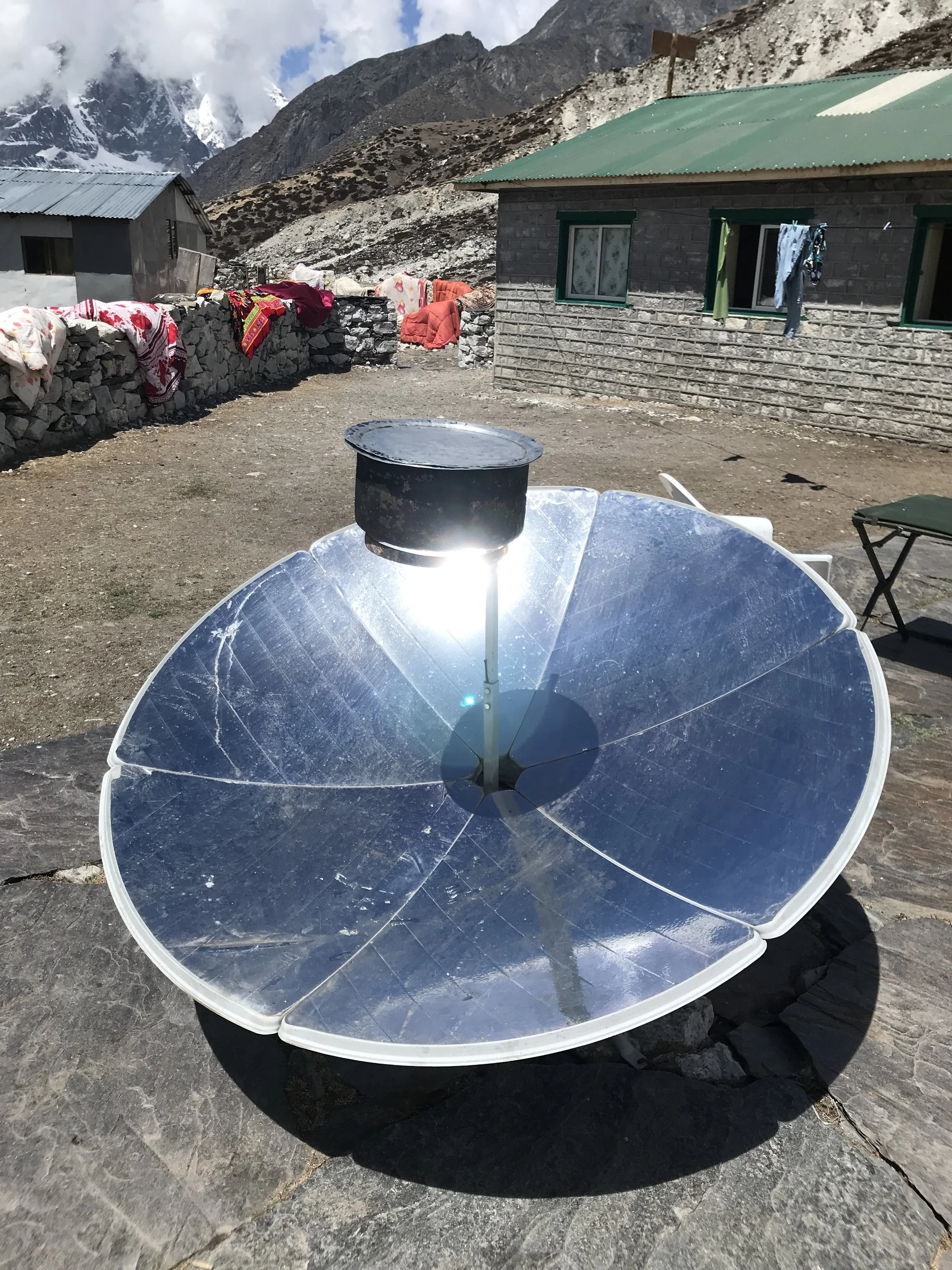 Now on the second half of our expedition, we began the day by bidding farewell to the amphitheater of stunning peaks and snowy ridges that surround Chukkung. The trail led us back towards Dingboche, covering the same stretch we had traversed 48 hours earlier. With the morning sun streaming from our backs, a few points of bright light shimmered in town. The cause of these was large circular solar dishes which funneled the heat into a single point like a magnifying glass, thus bringing large pots of water to a boil.