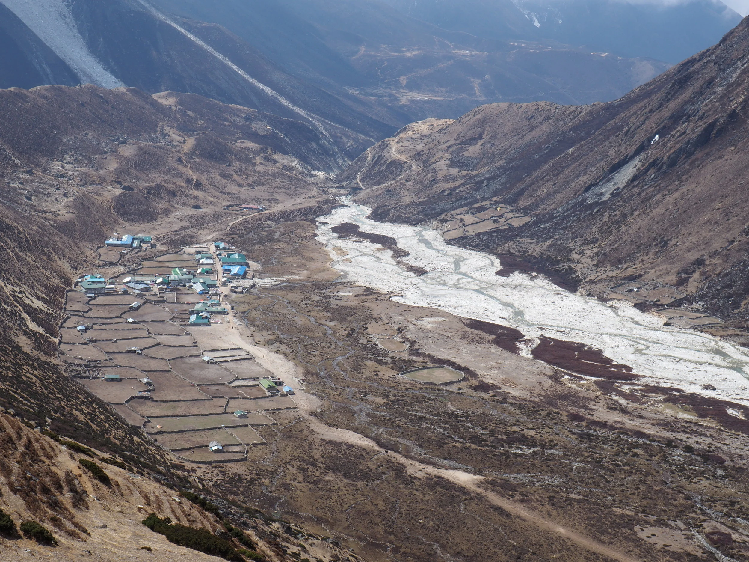 A strong tailwind pushed us further away from the valley that had held our attention for almost a week. I turned to get one last glimpse of Ama Dablam and was greeted with a full blast of icy wind to propel me along. The newest mountains were now on our left-hand side, separated by a wide valley that held a long river and a small village in its embrace.