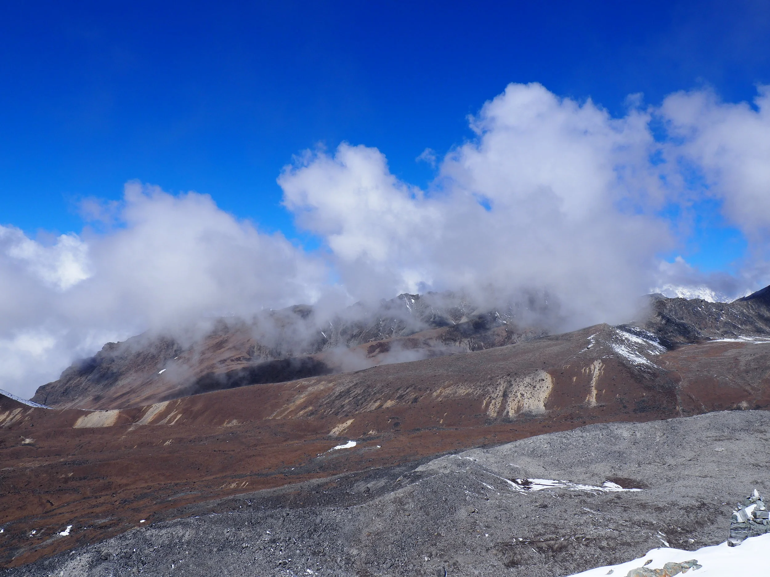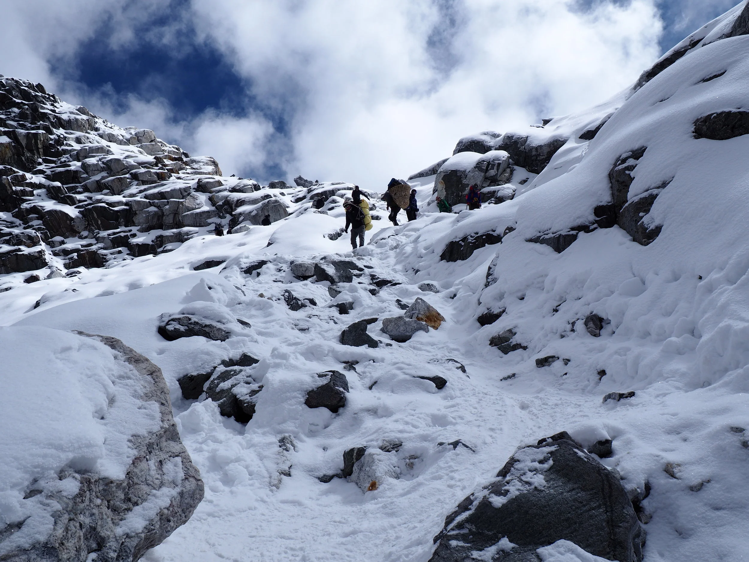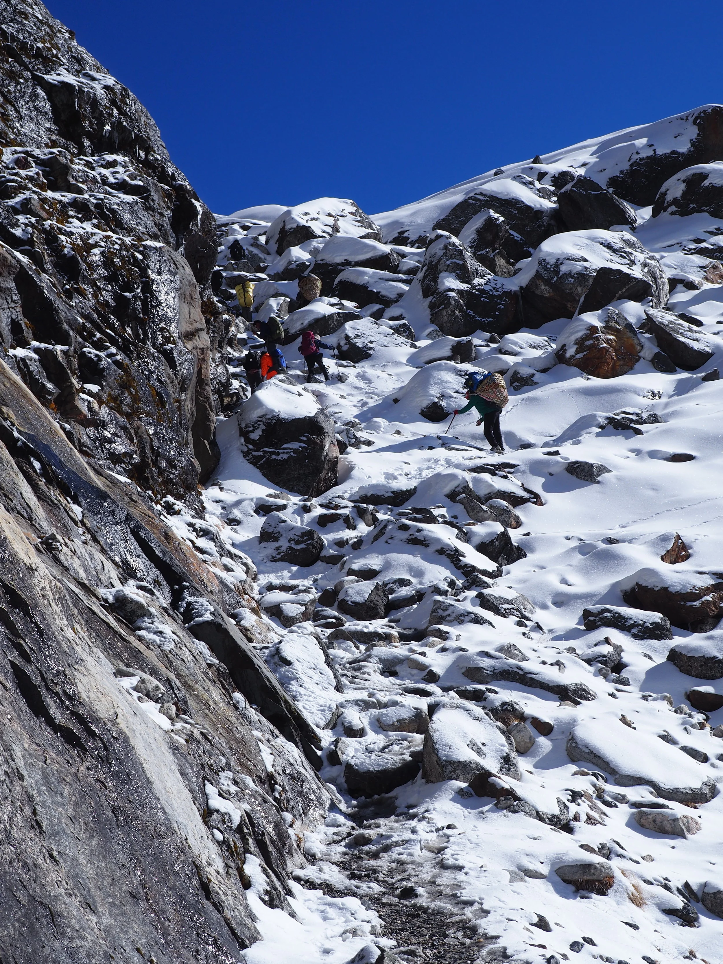 The panorama continued from left to right, running alongside a steep line of peaks until culminating in the shady presence of the Everest range. Due to the altitude and the constant sinking of our feet into snow and sludge, we barely had the presence of mind to enjoy these surroundings. The trail wound through pockets of shadow and sunlight, then quite suddenly got insanely steep. Soon we were climbing over boulders covered in slush up a treacherous incline while melting snow dripped on our hands from an overhanging rock wall.