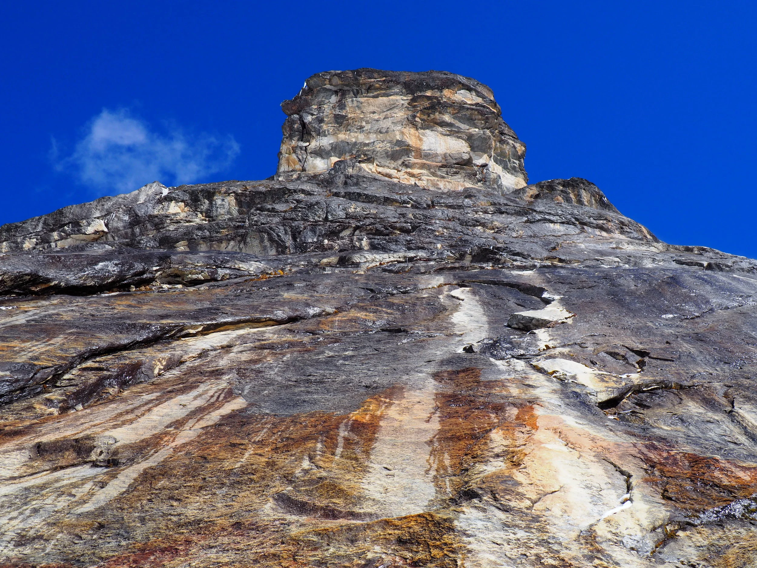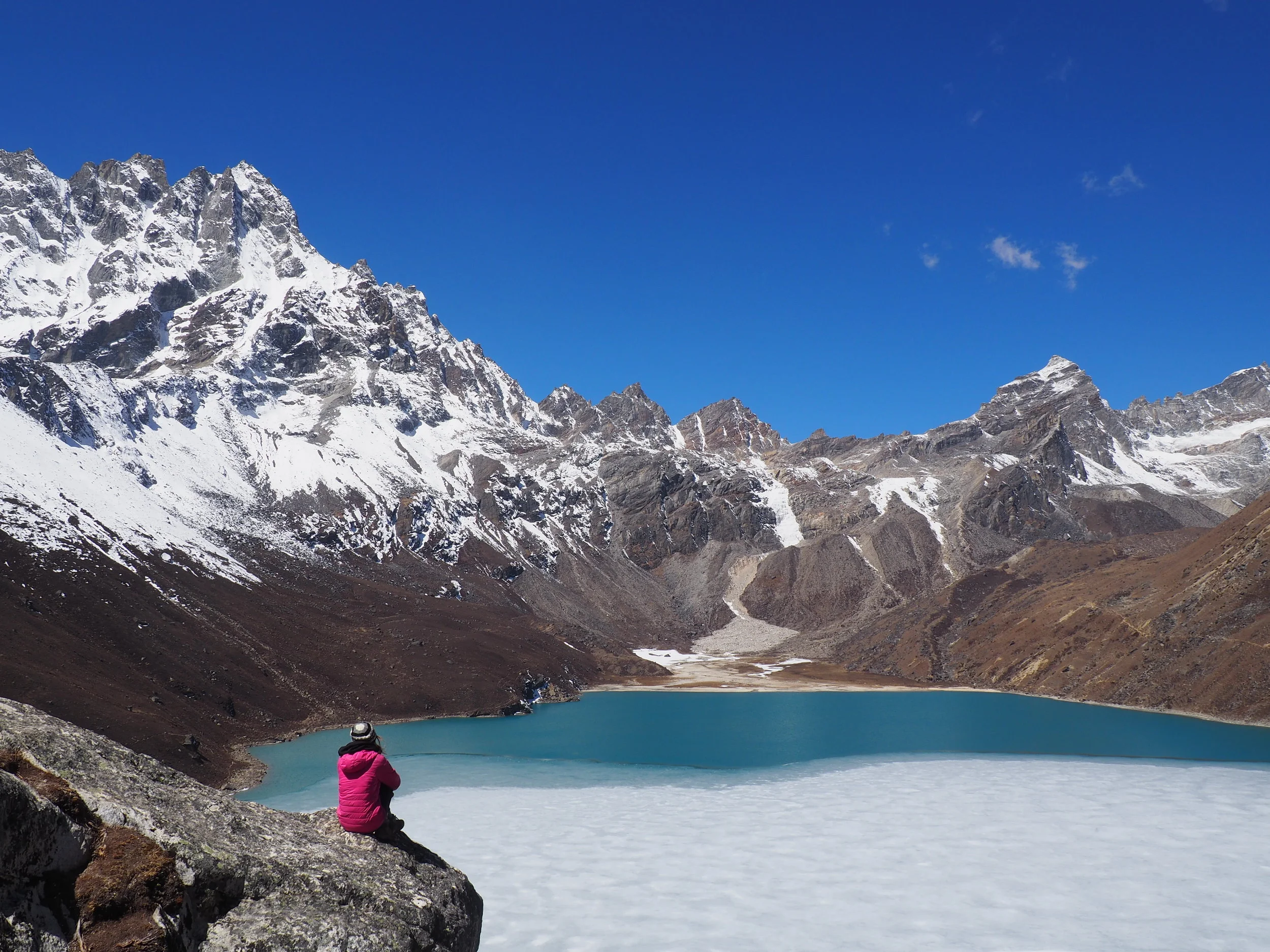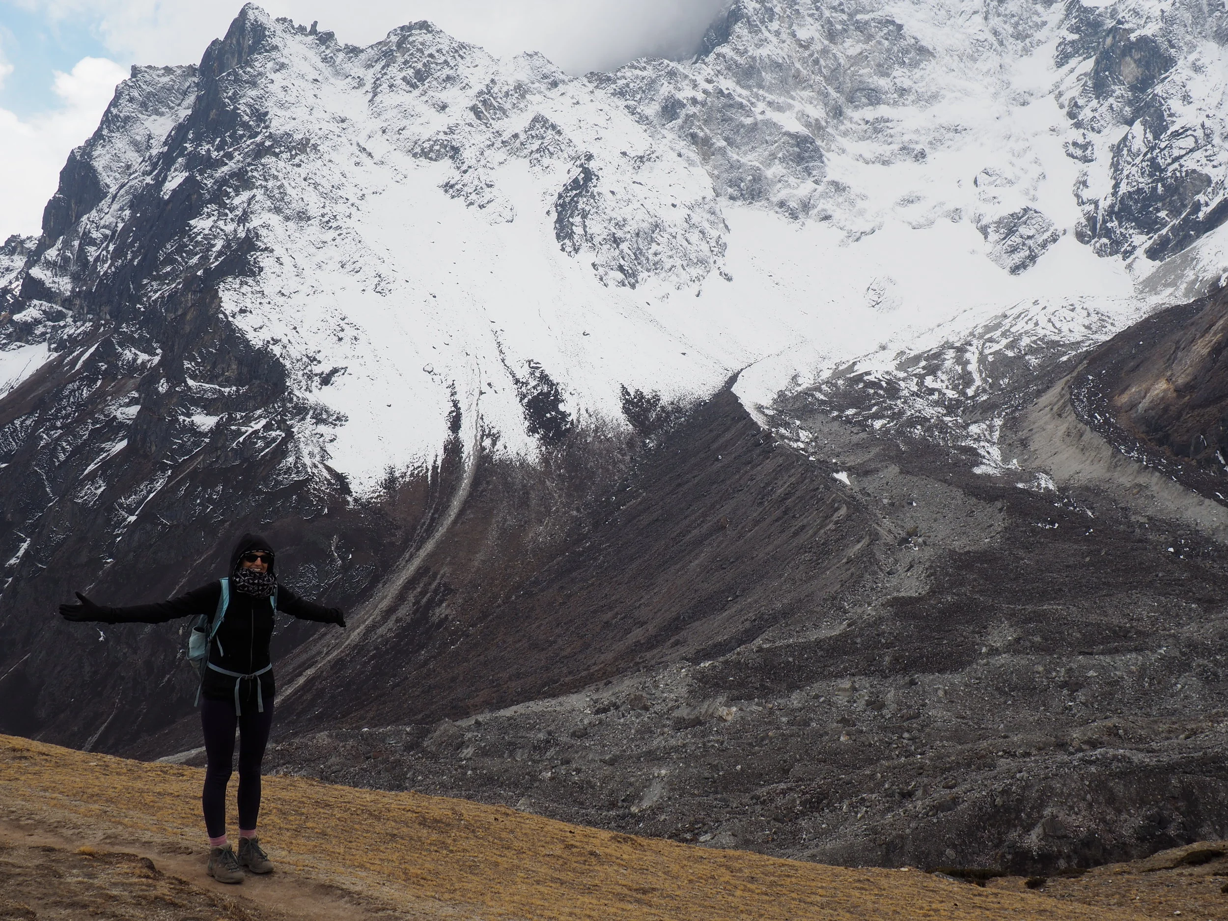 The panorama continued from left to right, running alongside a steep line of peaks until culminating in the shady presence of the Everest range. Due to the altitude and the constant sinking of our feet into snow and sludge, we barely had the presence of mind to enjoy these surroundings. The trail wound through pockets of shadow and sunlight, then quite suddenly got insanely steep. Soon we were climbing over boulders covered in slush up a treacherous incline while melting snow dripped on our hands from an overhanging rock wall.