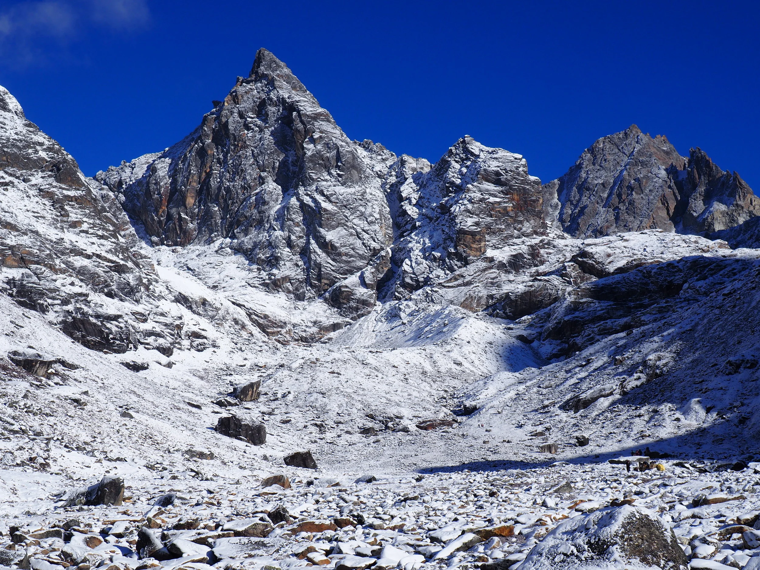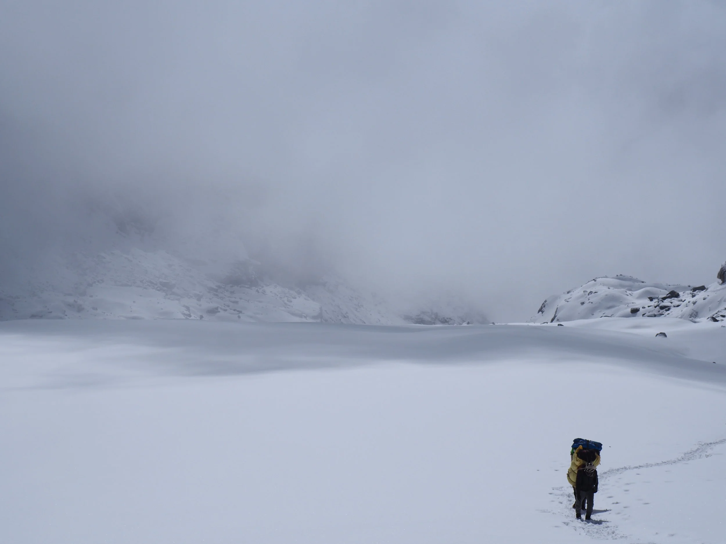 The snowstorm that accompanied our arrival in Dzongla failed to stop all night; by the time we awoke the next morning four inches of fresh powder encompassed our surroundings. The snow turned our the environment into a land of heavenly white; even peering back into the valley we had crossed yesterday was a majestic sight.