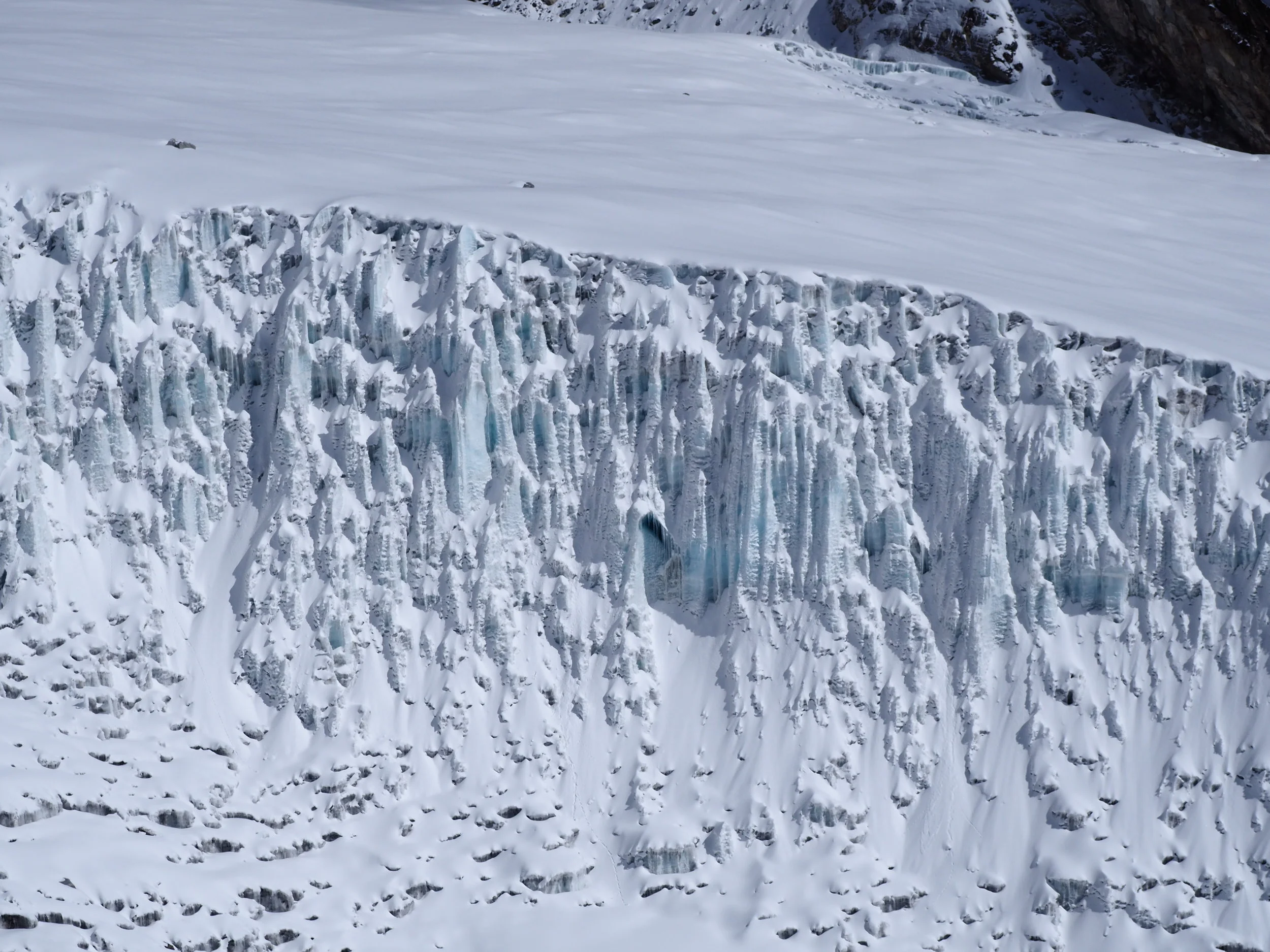 After a few minutes of taking in the sun-drenched snowy hillsides and catching our breath, we strapped on our crampons to cross a dangerous stretch. Here the fresh powder was almost a foot deep and the trail just a single boot width across, with the possibility of falling into a deep crevasse constantly on our minds. To our right a glacier began to swallow our view, with a front face of icy pillars that stretched 25 feet from top to bottom.