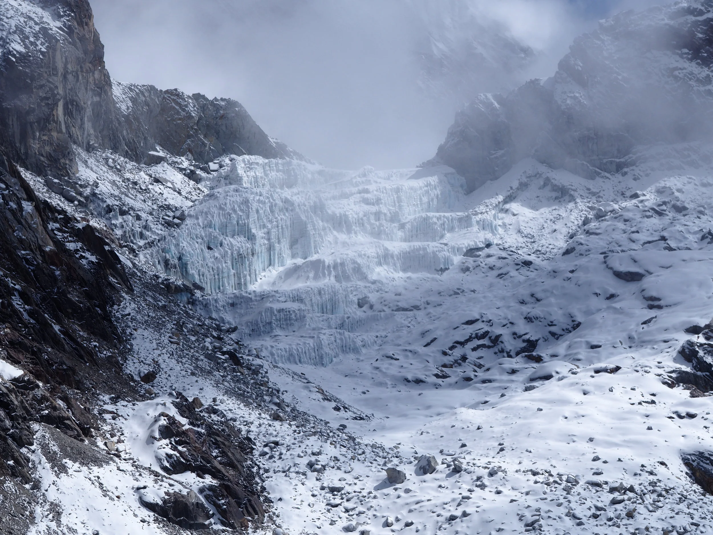 The topmost peaks were hidden by clouds, but that did little to detract from our growing sense of wonder. Monstrous scraggly rock cliffs held frozen waterfalls and hanging glaciers, while in the distance we could see a large black tongue of ice breaching the valley floor.