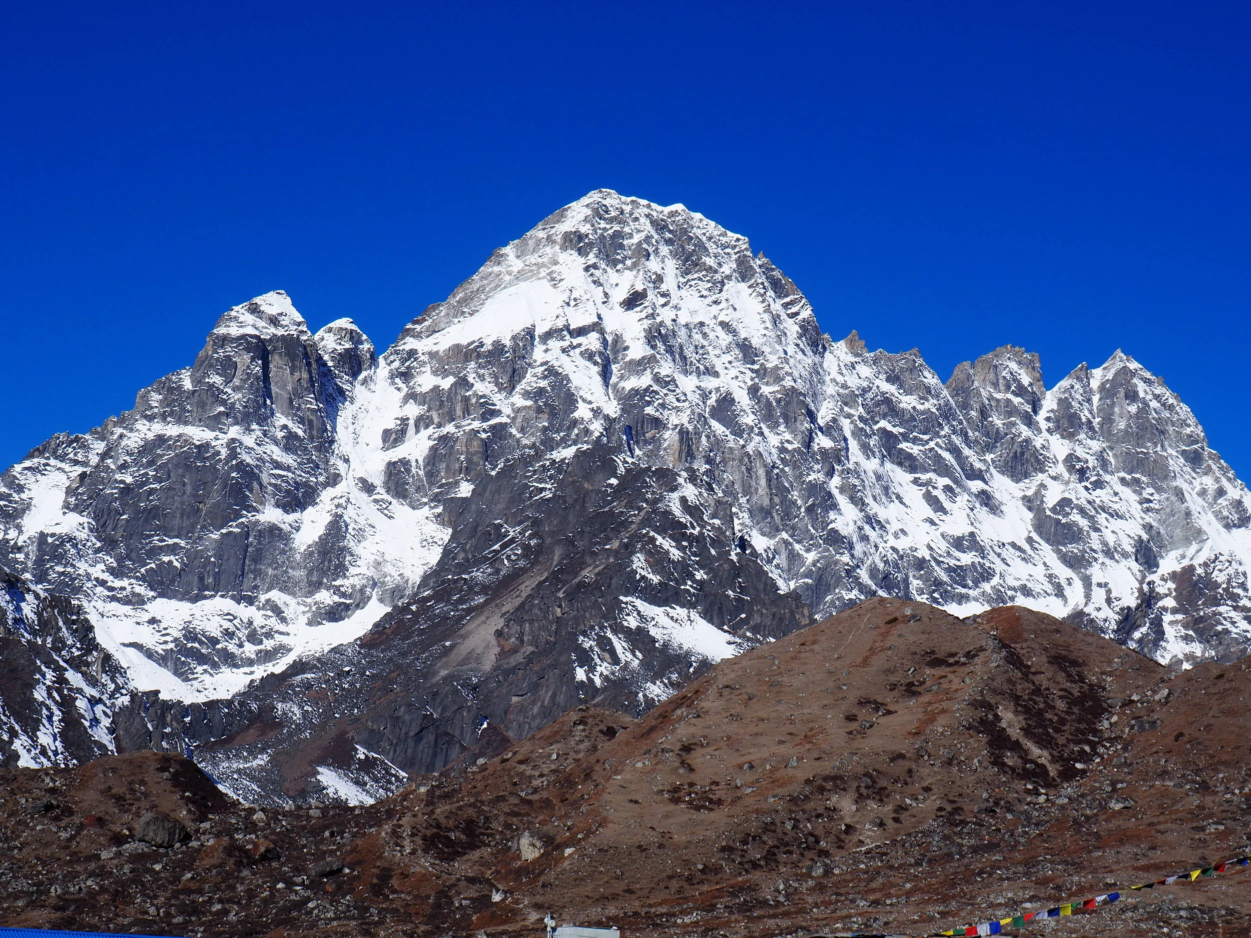 Cho Oyu, the world’s sixth highest peak, reflected the sharp light perfectly in the morning, with glimmering whites and sparkling silvers glaring straight into our eyes. Between the highest peaks we could glimpse thick layers of glaciated ice which dropped down in levels towards the broad valley.