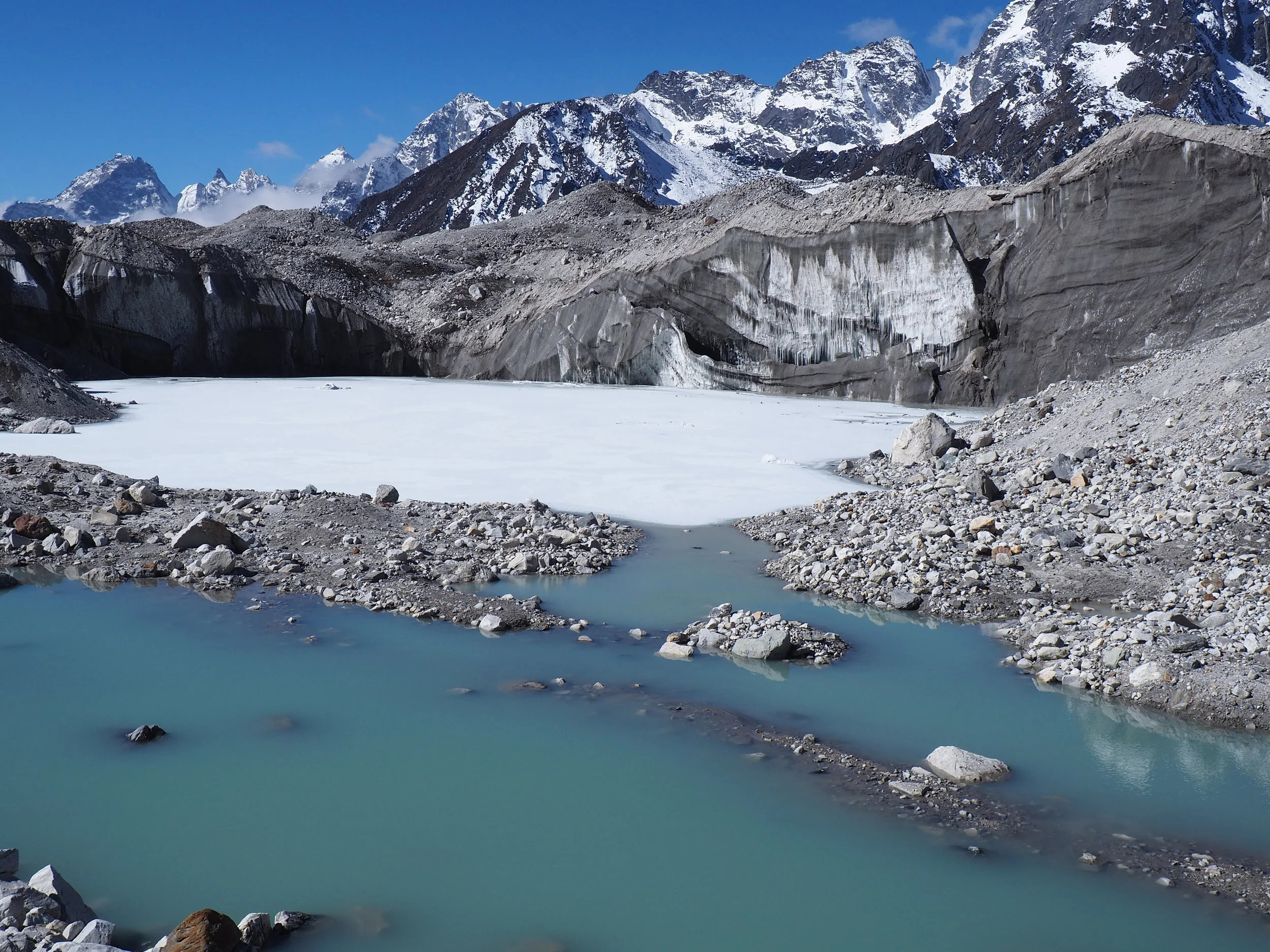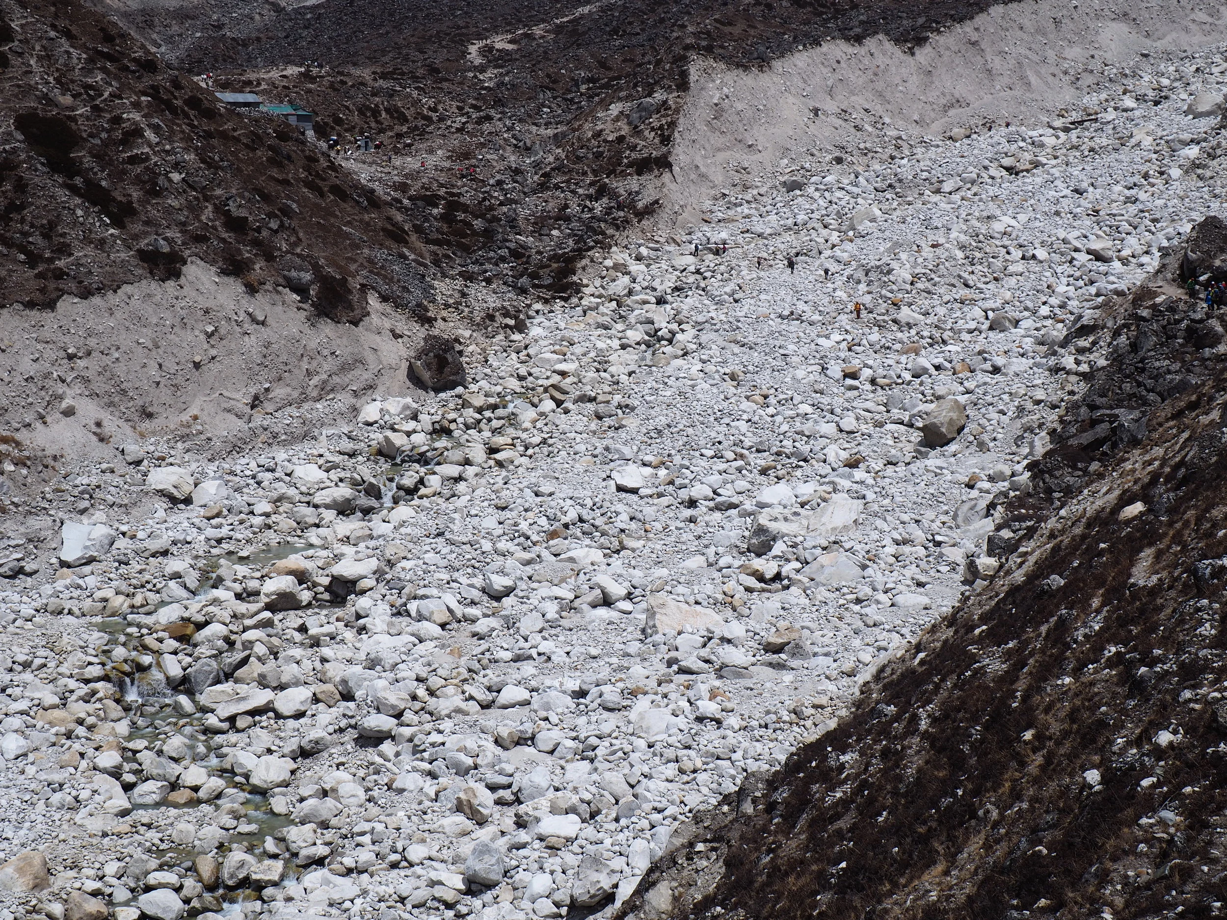 The path started off walking beneath a high ridge which hid our desired sunlight, diving us back into cold shadows and causing frost to rise from our mouths with each breath. Within just half an hour we had reached a steep ledge overlooking a long grey glacier, a vast unbroken chain of gravel and ice which stretched all the way back to Cho Oyu’s mountain range in the distance.
