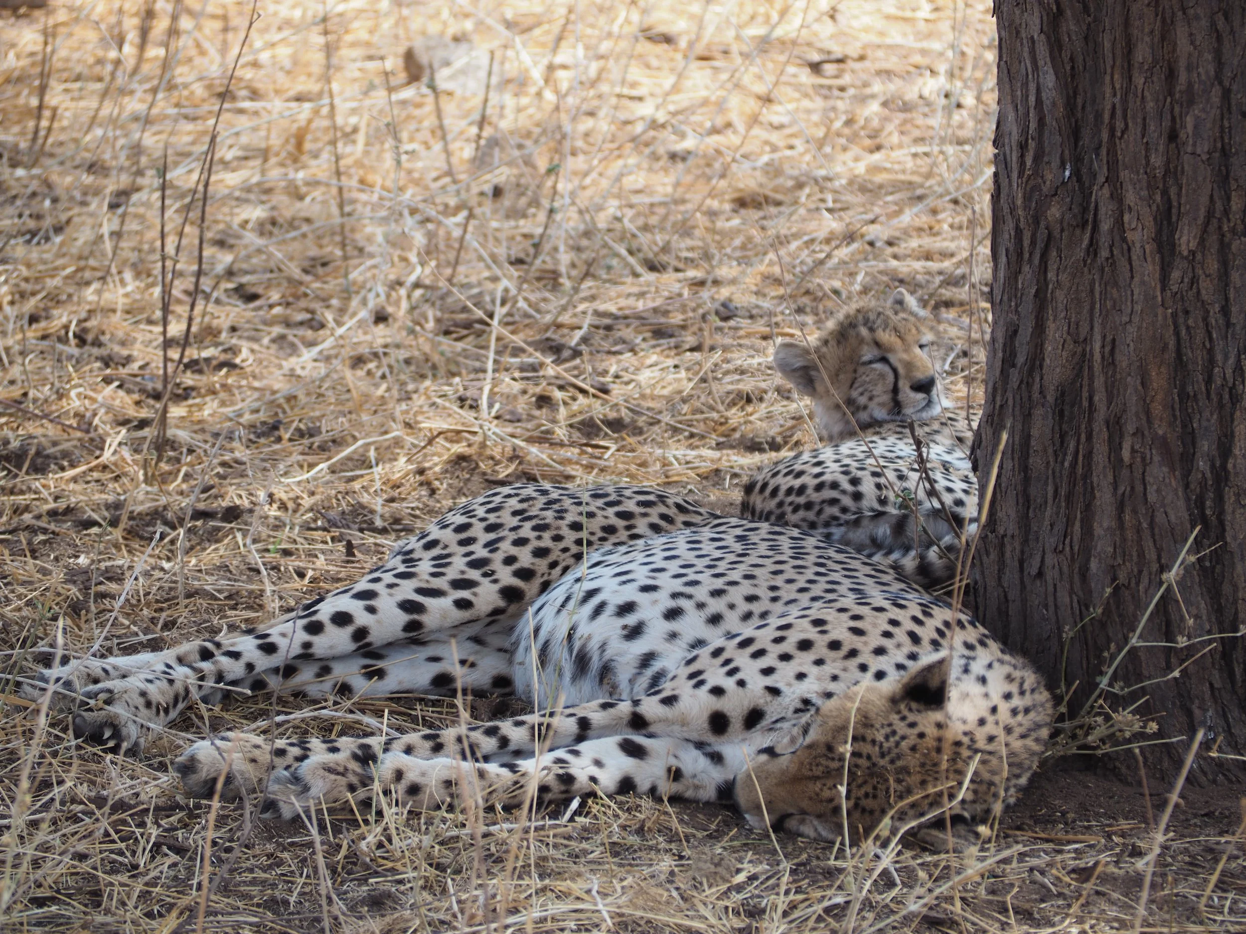 Just as the post-lunch slump was beginning to hit us, we found we weren't the only ones in the mood for an afternoon nap. A few meters from the side of the road, our guide excitedly pointed out a pair of sleeping cheetahs. Mother and child were planted under the tree, their lazy demeanor, soft fur, and endearing whiskers belying the fact that we were in the presence of one of the park's fastest and most ferocious predators.